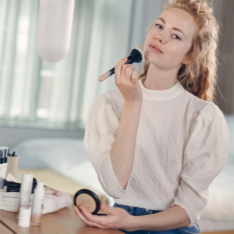 Appliquez la poudre sur le visage avec un pinceau pour matifier la peau ou fixer le fond de teint.